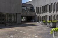 This stock photo depicts a row of empty concrete planters placed outside of a building in Toronto's bustling business district. The planters are surrounded by blooming flowers and towering buildings. The image captures the urban design and architectural elements of the city, with its cobblestone-lined roads and modern facades. The empty planters and open space create a sense of tranquility amidst the bustling city life. The photo is taken during the day, showcasing the vibrant colors of the surrounding trees and the clean lines of the buildings. The image highlights the distinct charm of Toronto's business district, making it suitable for various purposes such as illustrating urban design, university campuses, office buildings, and tourist attractions.