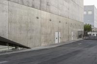 An empty concrete street in Los Angeles, California. The futuristic architecture and clear sky create a striking urban landscape. The absence of traffic highlights the structural elements and facades of the buildings.