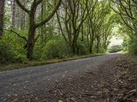 a empty country road runs through the forest with lush trees lining the sides of the road