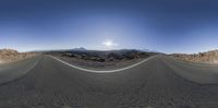 an empty desert road in the middle of nowhere and a mountain range in the background