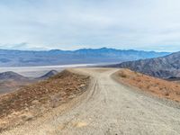 an empty dirt road leading to the mountains, with a very wide view of mountains