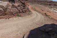 An empty dirt road in Utah's elevated landscape near red rock formations. The road winds through the mountains, surrounded by grass and rocks. A narrow path reveals the natural beauty of the desert.