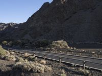 This stock photo shows an empty freeway running through the Spanish desert next to majestic mountains. The asphalt road stretches into the distance, surrounded by a stunning natural landscape. The mountains create a beautiful backdrop against the clear sky of Europe's Tenerife island. With no one in sight, this quiet rural road is the perfect representation of the tranquility of nature and the rugged beauty of Spain's geology. The road surface is lined with guard rails, providing safety along the thoroughfare as it traverses the mountain pass. The rock formations in the surrounding badlands and wadi valley add to the unique charm of this scenic location.