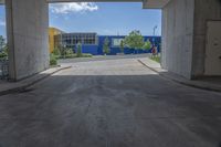This stock photo features an empty garage in Toronto, Ontario, Canada. The garage has lots of blue walls and trees growing outside of it, creating a beautiful urban open space. In the background, there is a large blue structure, adding to the urban design. The image is taken during the day, with clouds in the sky. The road surface is made of asphalt, and there is a hard shadow casting on the ground. The garage door is open, inviting viewers to imagine what lies inside. The concrete walls and tints and shades of blue create an interesting visual effect. This photo perfectly captures the urban environment of Toronto with its unique architecture and vegetation.