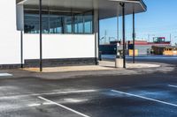This stock photo showcases an empty gas station and parking lot in Toronto, Ontario, Canada. The parking lot is made of asphalt and there are some glass walls on the side. The sky is clear and it is during the day. The image depicts a deserted scene, perfect to illustrate themes such as urban decay, economy, or shopping in Toronto.