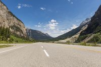 An empty highway stretches into the breathtaking Canadian Rockies of Canada. The asphalt road, with its straight yellow line ahead, cuts through the low-lying landscape of British Columbia and Alberta. It's a beautiful day to enjoy the majestic mountains, lush vegetation, and clear blue skies. The road surface, made of tar, provides a smooth thoroughfare for various modes of transport. Fluffy clouds float above, adding to the picturesque highland scenery. This stock photo captures the serene beauty of nature and the vast Canadian wilderness.