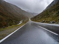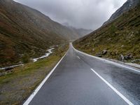 This dramatic stock photo shows an empty highway on a steep slope in Austria. The road surface, made of asphalt and tar, appears wet from rain. The image captures the gloomy atmosphere of the grey sky and the landscape, with mountains in the background. The dramatic clouds add to the overall sense of drama. This natural environment in Europe provides a stunning backdrop for this straight road leading down the highland.