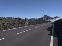 A lone motorcycle traverses an empty highway in the mountains of Tenerife, Spain. The asphalt road winds through a stunning landscape of lava formations and snow-capped peaks. High above the clouds, the clear sky reveals the beauty of Europe's elevated nature.