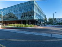 Empty intersection in Los Angeles, California, with modern architecture and glass panelled buildings. Clear sky casts hard shadows on the road. A depiction of vibrant city life in the USA.