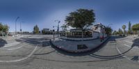 An empty intersection in an urban area, with clear skies and buildings in the background. The absence of people creates a sense of solitude in the city. Urban design and infrastructure are highlighted in this peaceful neighborhood.