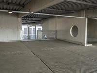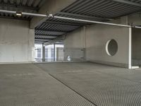 This stock photo features an empty modern building in Germany. The building has a large grey and white exterior, with a round window in the middle. The architecture is sleek and modern, blending composite materials and concrete. The building is surrounded by open space and a parking deck. The road surface in front of the building is made of asphalt. The image captures the building during a bright and sunny day, with tints and shades adding depth to the scene. The hall inside the building has wooden flooring and a line of rectangular doors. The ceiling is concrete and the walls are grey. Overall, this photo represents contemporary architecture and a spacious property in Germany, offering endless possibilities and potential.