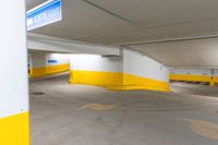 an empty parking garage with yellow painted walls and flooring and an exit sign in the foreground