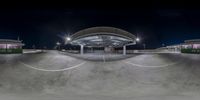 An empty parking garage at night with a skateboarder doing tricks on the ramp. The artificial light creates a dramatic atmosphere in the concrete structure. The city skyline is visible in the distance.