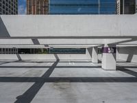 Aerial view of an empty parking garage with lots of open spaces in front of tall buildings with glass windows in Miami, Florida, USA. This urban design perfectly captures the city life and the vibrant atmosphere of Miami Beach. The elevated position of the photo offers a high perspective, showcasing the concrete surfaces and the open space within the city. The clear blue sky with fluffy clouds completes the picture of a modern and bustling urban environment. This top-down view of the parking lot highlights the efficiency and functionality of urban planning in Miami, making it a perfect representation of city living in this vibrant Florida city.