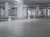 This stock photo depicts an empty parking garage full of cars and trucks at night time in the white room of a building in Hamburg, Germany. The spacious open space is lined with white walls and flooring, with columns and a concrete ceiling. The concrete streets of Hamburg, Deutschland can be seen through the entrance. This urban scene captures the architectural design of the parking garage in Europe.