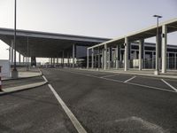 Empty parking lot at an airport, showcasing a well-designed facade. The asphalt road surface reflects the architecture of the surrounding buildings. Awaiting passengers in a city bustling with urban design.