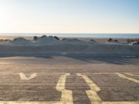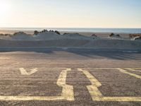 This stock photo captures an empty parking lot located by the beach. The image showcases a vast landscape with clear skies and a visible sun. The asphalt road surface leads to the horizon where the ocean meets the sandy shore. This serene coastal scene is reminiscent of the beautiful beaches in Holland, Netherlands, providing a feeling of tranquility and a connection with nature.