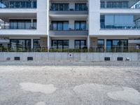 an empty parking lot near a white building in a large block of apartment complex with windows