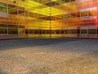 Empty Parking Lot with Brightly Colored Buildings Reflected in Windows