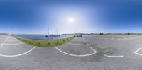 a fisheye photo shows an empty parking lot and boats on a calm lake shore