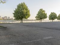 A spacious empty parking lot with trees in the foreground and a stunning view of the cityscape in the distance. This beautiful urban landscape captures the essence of an early morning in Milwaukee, Wisconsin, USA. The architectural marvels along the coastal region harmonize with the tranquil waters of the adjacent ocean. The asphalt road surface leads to a residential area surrounded by lush green grass and open spaces. The woody plants and trees provide a natural touch to the serene atmosphere. The clear sky above showcases a picturesque skyline, making it an ideal location for recreational activities and enjoying nature's beauty in this suburban setting.