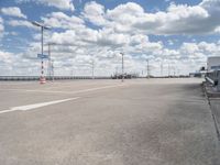 the empty parking lot is near some building and cloudy skies at daytimes time on the day