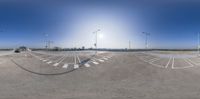 an empty parking lot on a clear day with some street lights in the background and traffic going by
