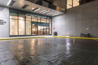 An empty parking lot in the heart of Montreal, illuminated by street lights. The closed doors and parking meter suggest a city at rest. The wet ground adds to the reflective urban atmosphere.