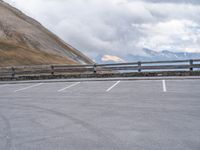 This stock photo features an empty parking lot located in Austria, surrounded by breathtaking mountain views. The panoramic landscape showcases the beauty of this European country. The asphalt road leads to the parking lot, with an Armco barrier and a guard rail for safety. The open space offers plenty of room for parking. The image is taken during the day, with fluffy white clouds in the sky. It is a perfect representation of the natural beauty and tranquility of Austria.
