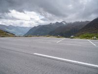 This stock photo shows an empty parking lot located amidst a stunning landscape with majestic mountains in the background. The asphalt road leading to the open space creates a sense of depth. The gloomy atmosphere is emphasized by the grey sky and clouds above. The serene beauty of nature and the absence of cars make this image perfect for illustrating concepts like tranquility, peacefulness, and solitude. It is also a great visual representation of European landscapes, specifically in Austria.