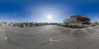 the 360 - view of the empty parking lot in front of an office building with its light shining on
