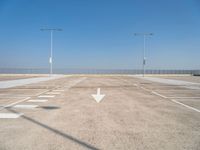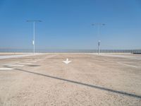 This stock photo features an empty parking lot on a sunny day. The lot is paved with asphalt, and two street lights are visible on each pole. The clear blue sky and modern architecture in the background add to the overall aesthetic of the scene. Captured in Holland, Netherlands, this image showcases the open space and concrete street design commonly found in European cities.