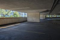 an empty parking lot with a concrete wall and trees in the background and buildings on both sides