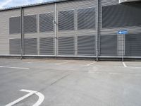 This stock photo features an empty parking lot near a building in urban Berlin. The building has several windows on its metal wall and a blue traffic sign. The cobblestone road and concrete surface create a modern urban design. It's a sunny day, providing ample light to the parking deck and garage. The concrete street and wall add to the urban aesthetic of the location.