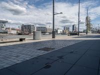 Empty parking space and sidewalk on the beach in Bremen. Tall buildings in the distance create a modern cityscape. Clear sky and calm waters of the harbor enhance the serene atmosphere.