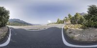 An empty paved road winds through the mountainous landscape of Spain. The straight road leads through a valley, offering a breathtaking view from the front seat. A perfect spot for a road trip in Europe.