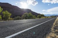 This stock photo features an empty paved road in the Utah desert. The road stretches out in front, surrounded by beautiful mountains, bushes, and trees on either side. The landscape is characterized by low, red rock mountains. The photo captures the scene during the day, with the dawn sunlight illuminating the landscape. The clear sky showcases the picturesque canyonlands of Utah. This road is known as Sandthrax Highway, located in North Wash, Utah. Enjoy the beauty of this sunny landscape with the sun visible in the background.