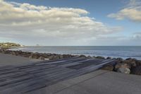 the pier is empty and ready to be used for surfing by the water or in the sun