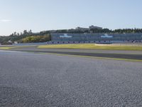 an empty race track with some grass and trees on the hillside behind it and a building in the distance