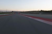 This stock photo captures the view from the driver's seat of a car driving on an empty racetrack. The photograph showcases the road surface made of smooth asphalt, leading straight down the road with motion blur. The controlled access highway, with lanes marked by lines, is a perfect representation of infrastructure and a mode of transport. The image also exhibits a prominent red stadium in the background, providing an atmosphere of racing. The clear sky adds a sense of serenity to the scene.