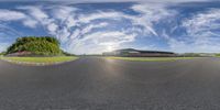 a view of an empty racing track from below and behind the camera lens, with a lot of grass