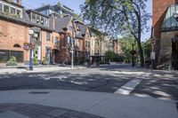 This stock photo features an empty residential street in the city of Toronto, Canada. The photo showcases the classic architecture of the buildings in the neighborhood, with houses lining the road. The asphalt road surface is well-maintained, with a hard shadow cast by the nearby trees. The image captures the peacefulness of this urban residential area during the day, highlighting the infrastructure and urban design of the town. This stock photo is perfect for illustrating concepts related to city life, human settlement, and urban living in Toronto, Ontario, Canada.