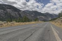 An empty road in British Columbia, Canada, surrounded by breathtaking mountainous landscape. The blue sky with white clouds enhances the magnificent nature of this highland region.