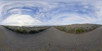 An empty open road in California, surrounded by coastal vegetation and mountain landforms. The cloudy sky creates a gloomy atmosphere, contrasting with the yellow dotted line on the asphalt road. A serene and rugged coastal landscape.