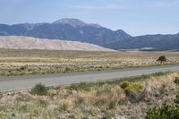This stock photo features an open desert in Colorado, USA. In the background, you can see large mountains, creating a beautiful landscape. A clear sky can be seen above. The road is empty and stretches across the desert, inviting you to embark on a journey. In the foreground, there is a sign, possibly indicating directions or a point of interest. The desert is filled with natural vegetation, adding to the beauty of the scene. The rugged and wild nature of the surroundings creates a sense of adventure, while the asphalt road provides a modern infrastructure for transportation. This image is perfect for showcasing the vastness and natural beauty of Colorado's wilderness.