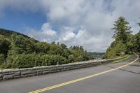 An empty road winding through a lush forest landscape with mountains in the background. The green trees and vegetation contrast beautifully against the clear blue sky. Nature's beauty at its finest.
