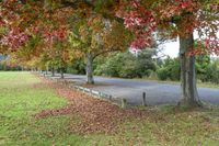 an empty road is lined with red and yellow trees in autumn foliage on either side of the road