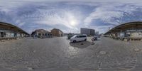 an empty road with parked cars and buildings on the side of it in front of a sky