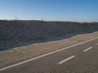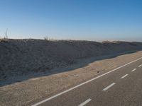 A scenic view of an empty road surrounded by vegetation and a clear sky in Holland, Netherlands. The road surface is made of asphalt, leading towards the horizon. The landscape features sandy soil and dunes on the beach, with the coastline and ocean in the background.
