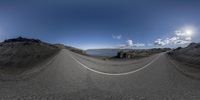 a fish eye view of a very empty road near a lake and some mountains and hills